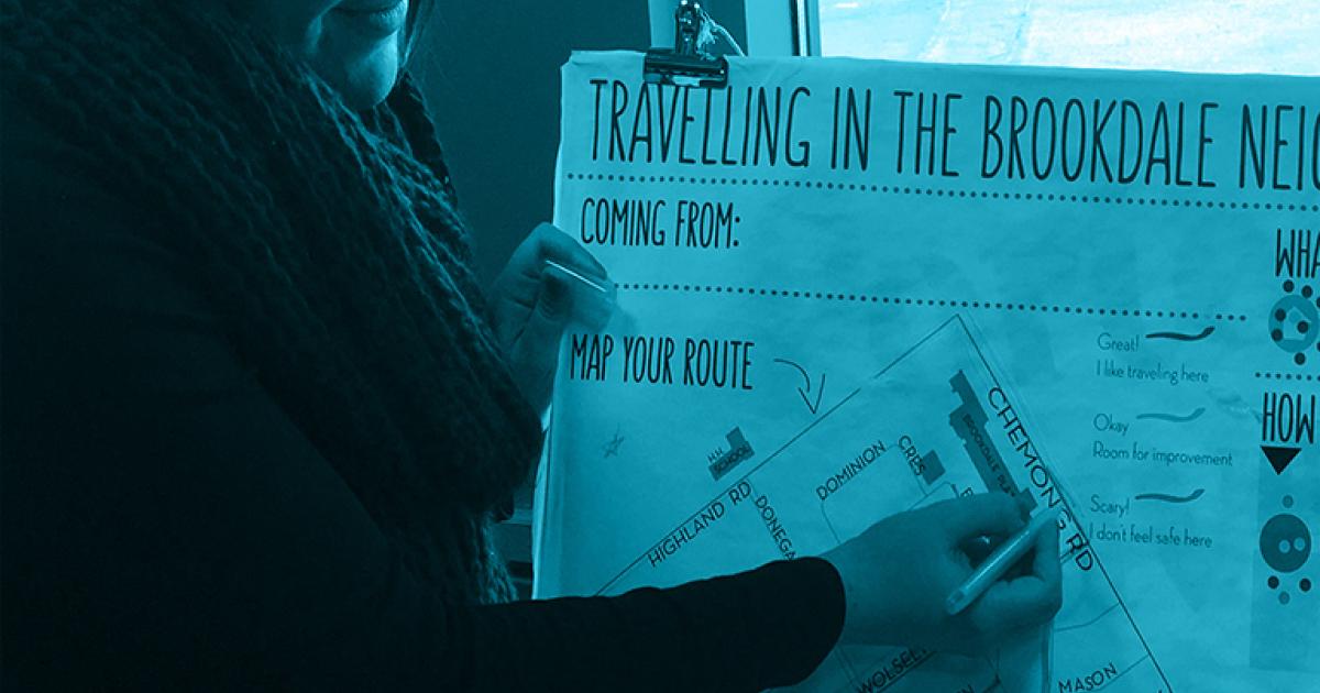 Au moyen d’une grande carte de base imprimée, laissez les participants tracer des itinéraires qu’ils utilisent fréquemment dans le voisinage. Utilisez des crayons verts, jaunes et rouges pour indiquer leur sentiment de sécurité aux différentes intersections (voir l’exemple de carte et légende dans la section « Ressources »). Utilisez du papier calque placé par-dessus la carte originale pour recueillir l’expérience et les commentaires de chaque personne tout en pouvant voir aussi émerger les tendances. Demandez aux résidents d’écrire pourquoi exactement ils se sentent sécurité ou non sur ces trajets.